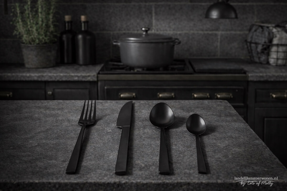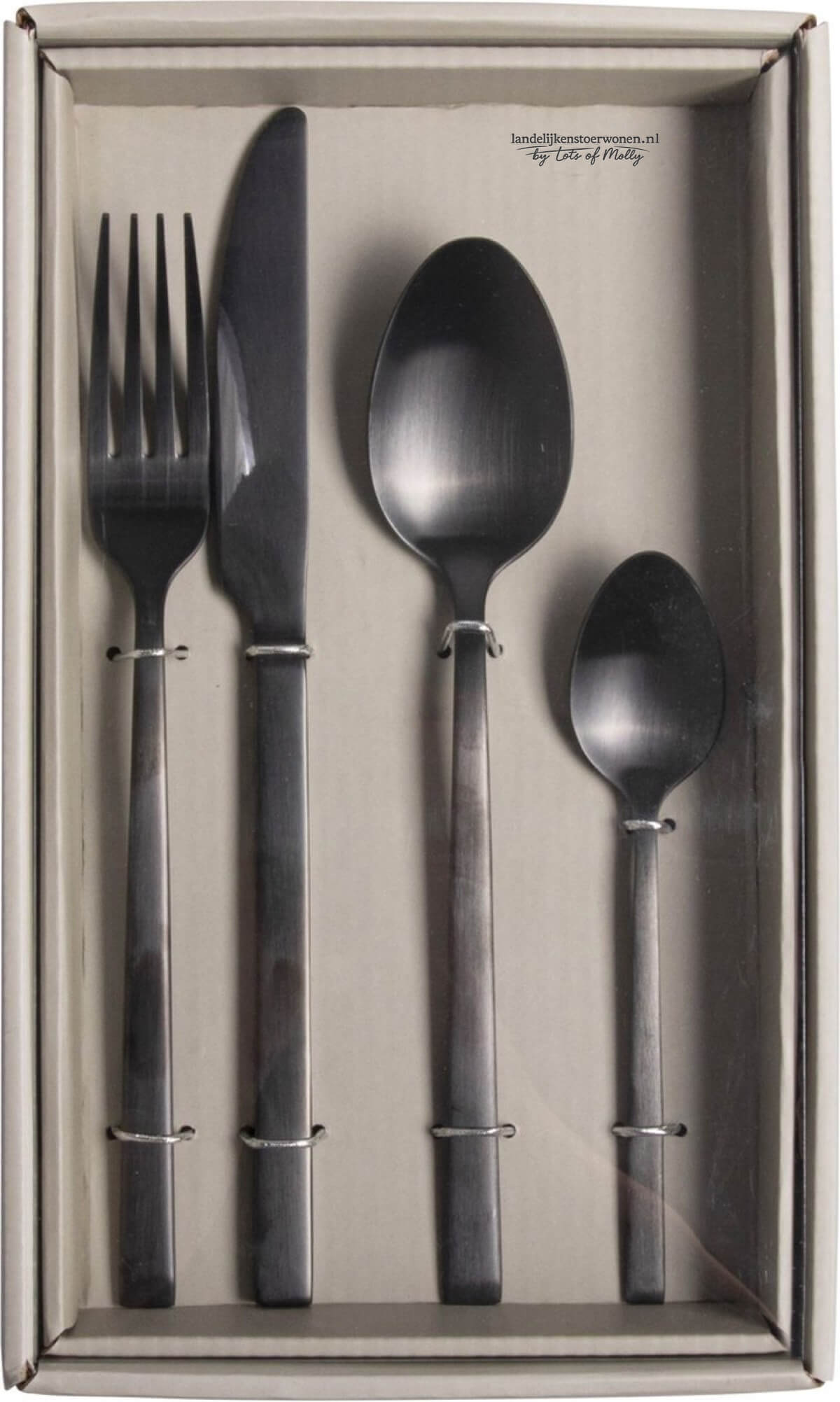 Deze 16-delige bestekset is geschikt voor 4 personen en bestaat uit 4 messen, 4 vorken, 4 lepels en 4 dessertlepels. Het bestek is gemaakt van hoogwaardig roestvrij staal en afgewerkt in matzwart