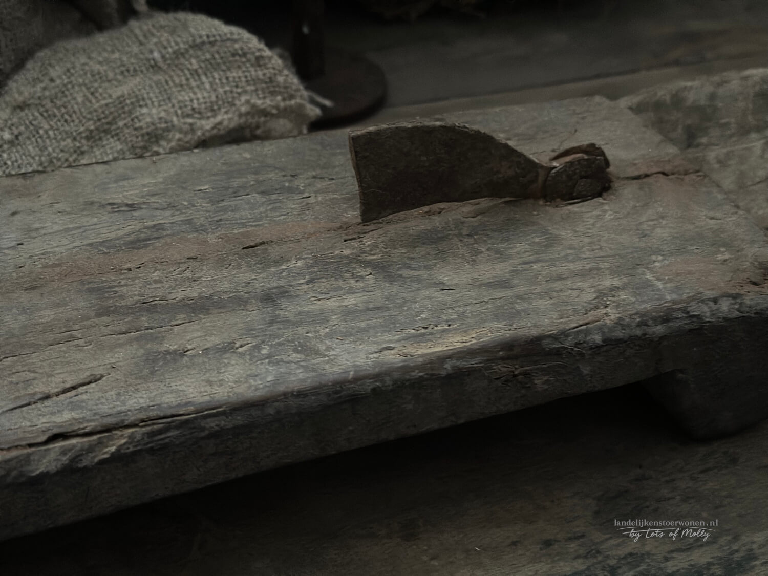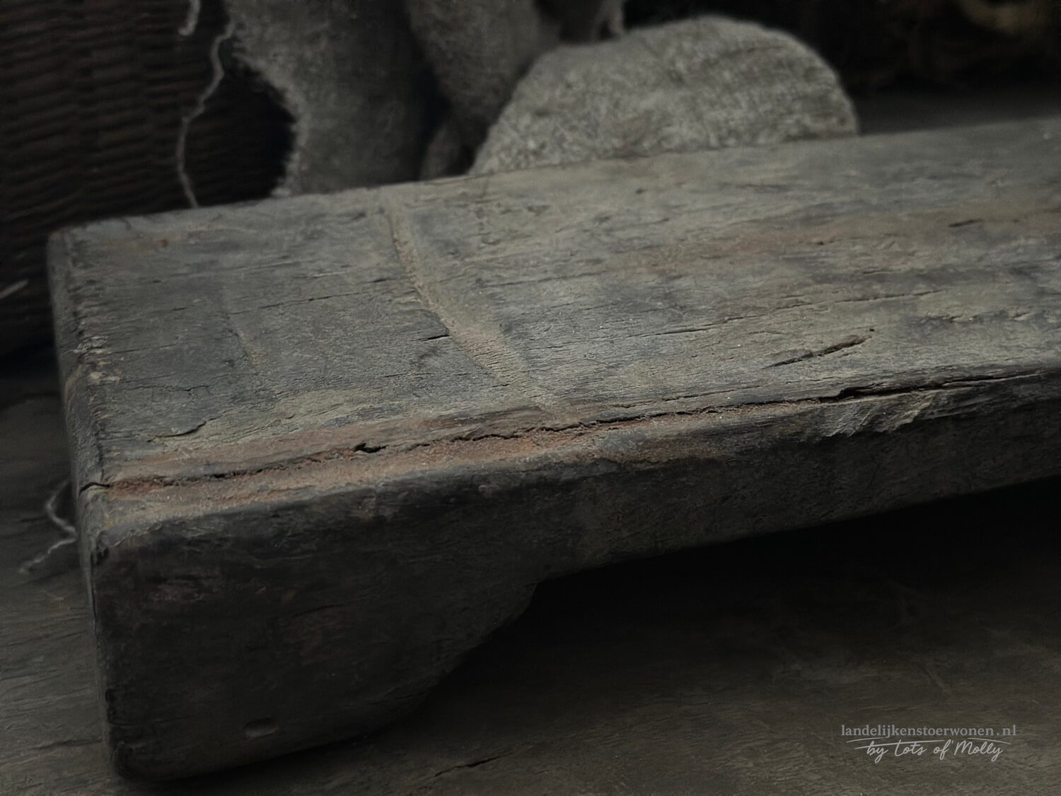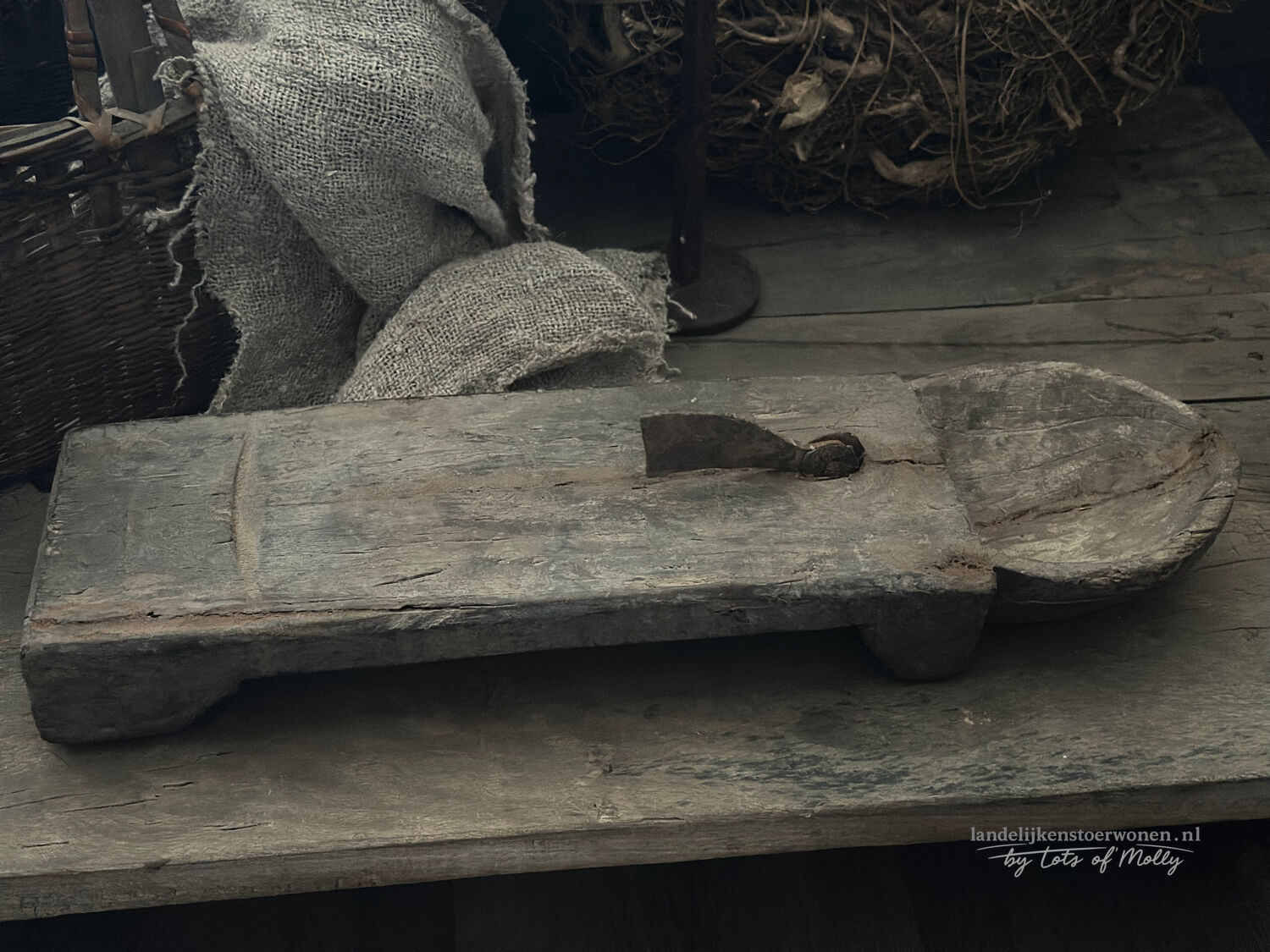 Authentieke houten kokosnootsnijder met een stoere, doorleefde uitstraling