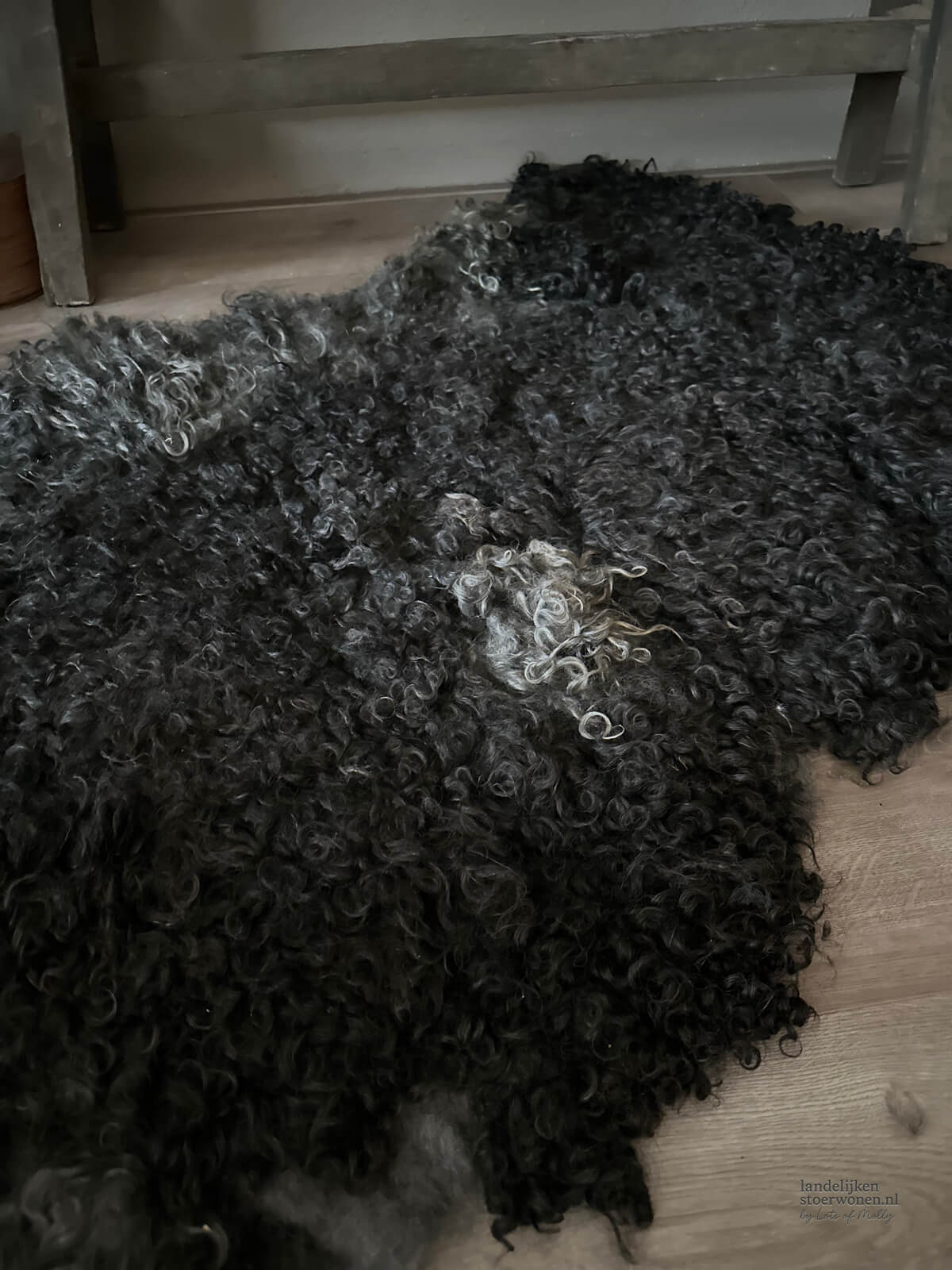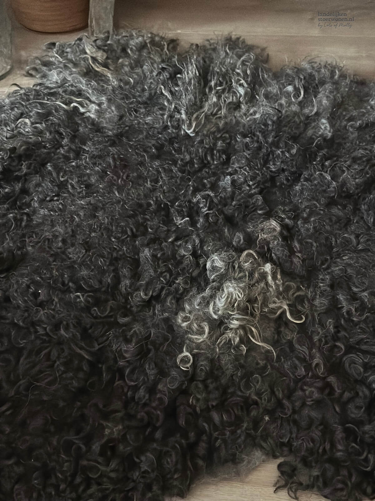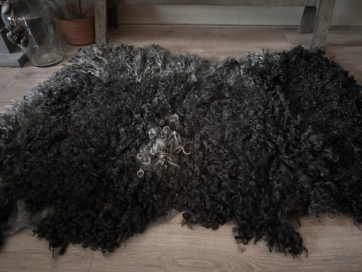 Gevilte schapenvacht van het Gotland schaap in zwart-grijze tinten. Met volle krullen, diervriendelijk verkregen en zorgvuldig ambachtelijk verwerkt