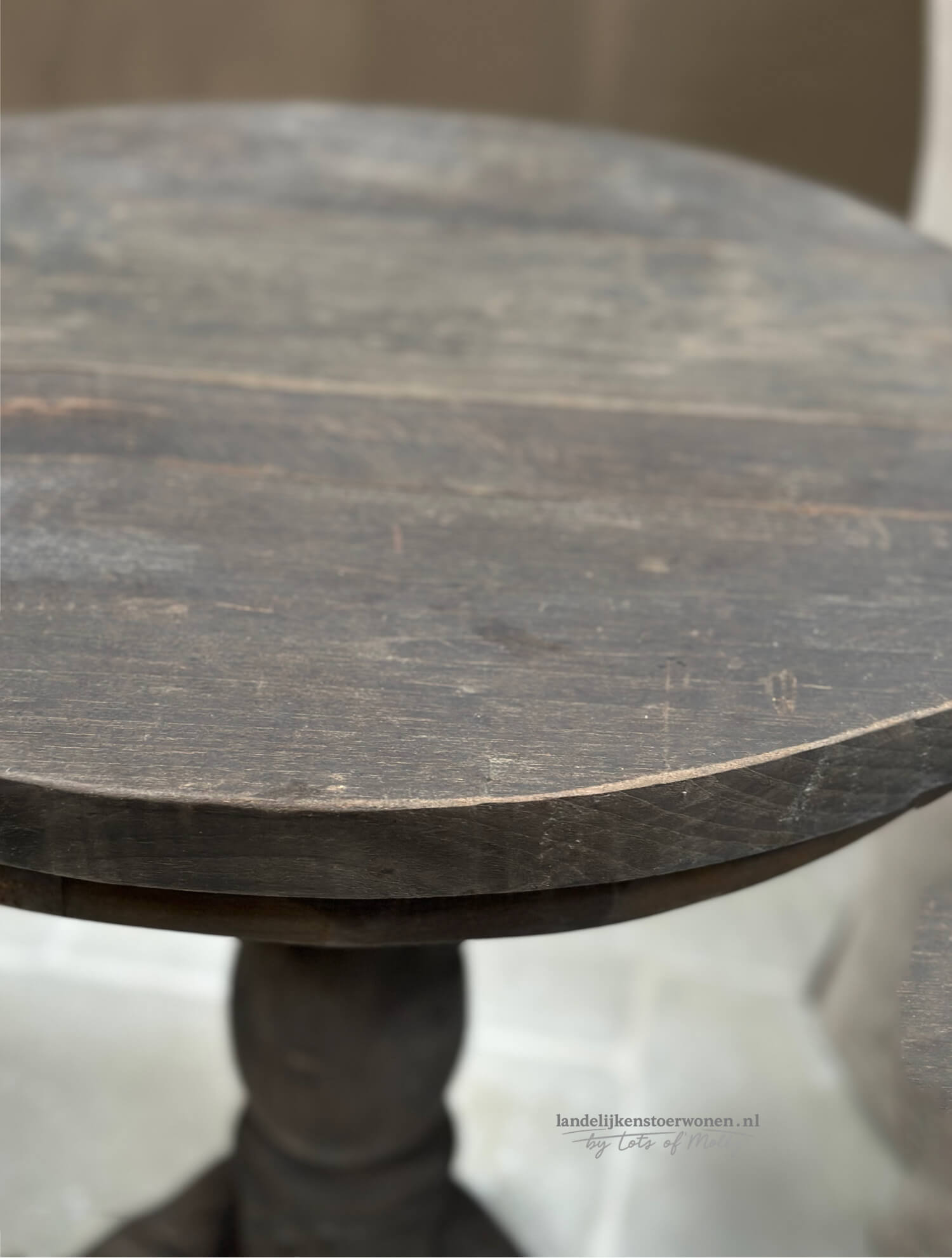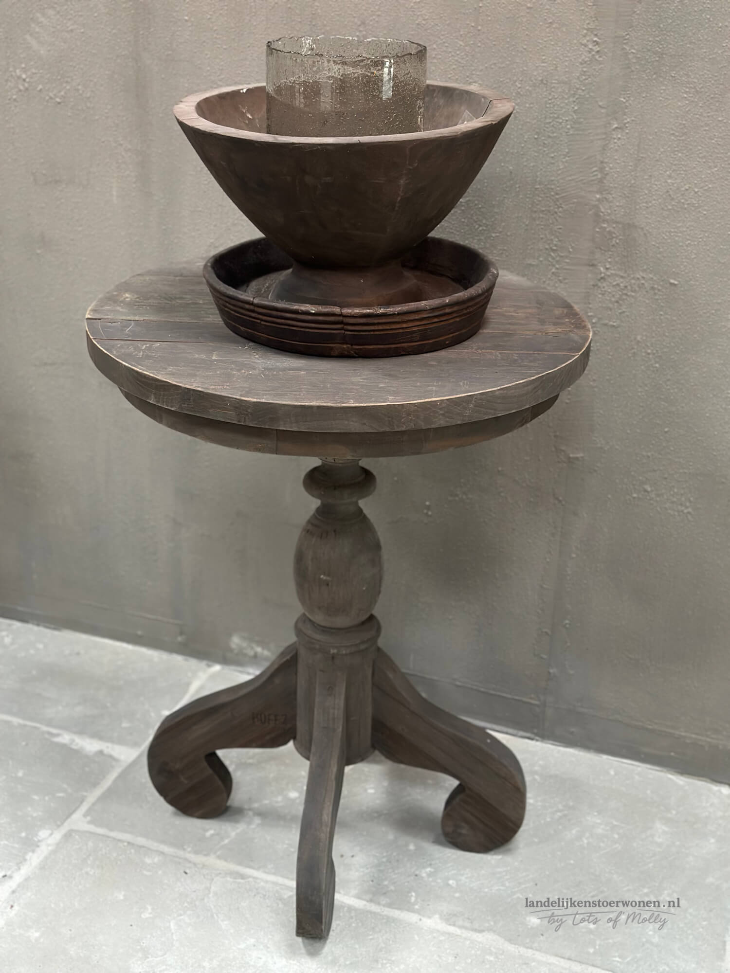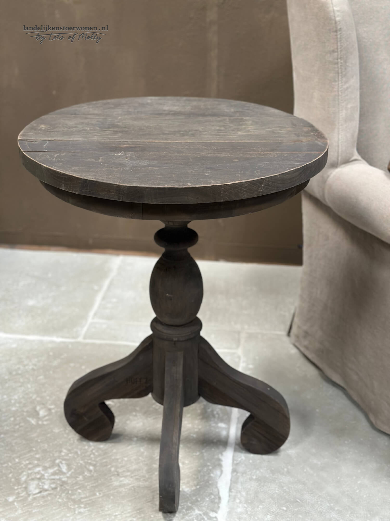 Stoere houten wijntafel van Hoffz met een doorsnede van 60 cm. Het ronde blad en de karaktervolle poot geven deze bijzettafel een warme, landelijke look