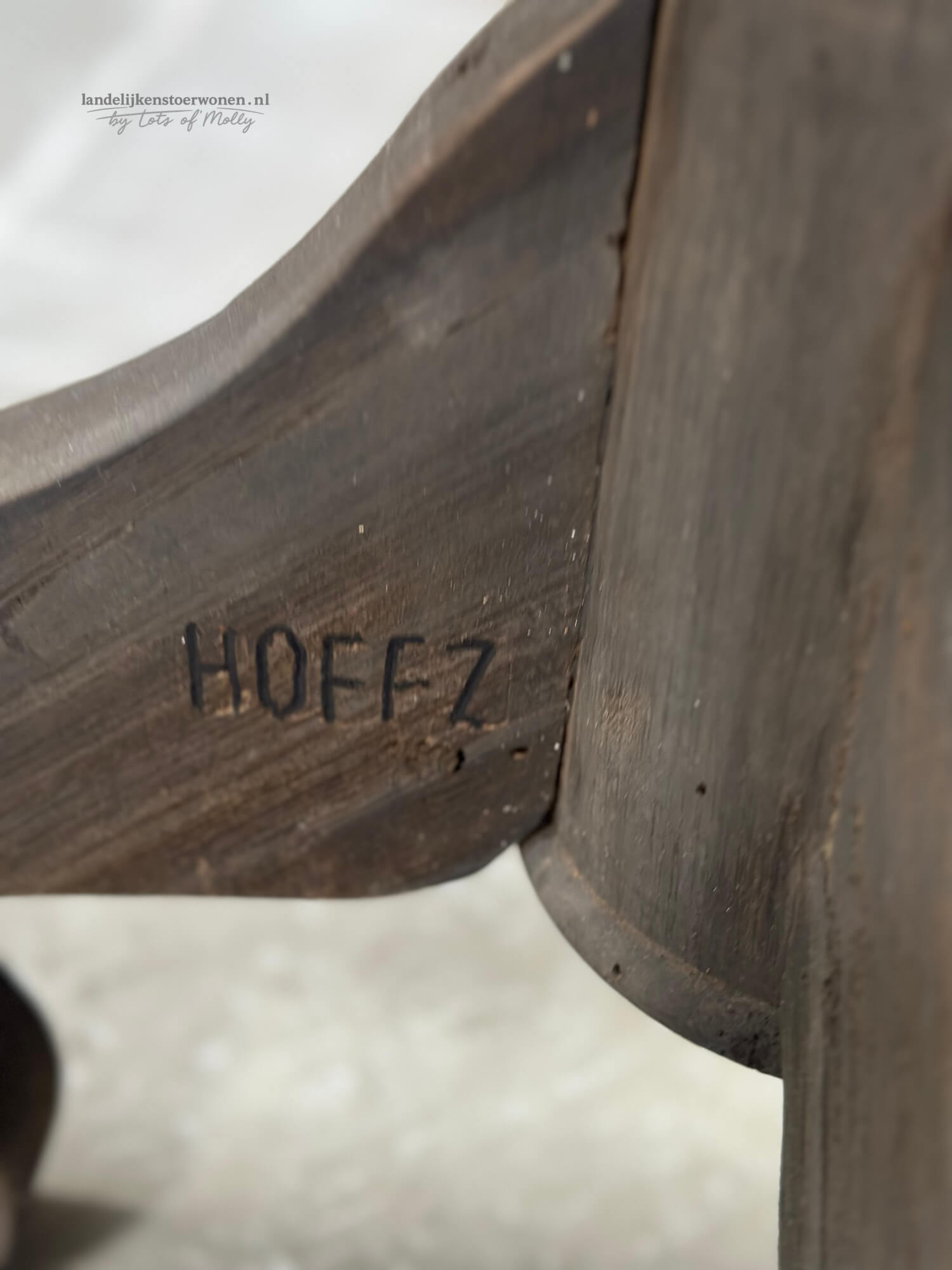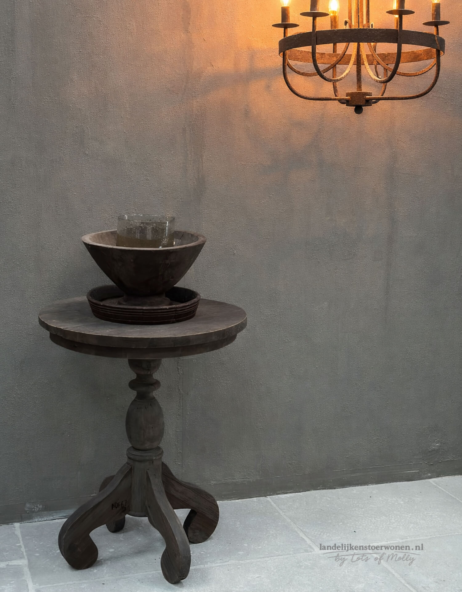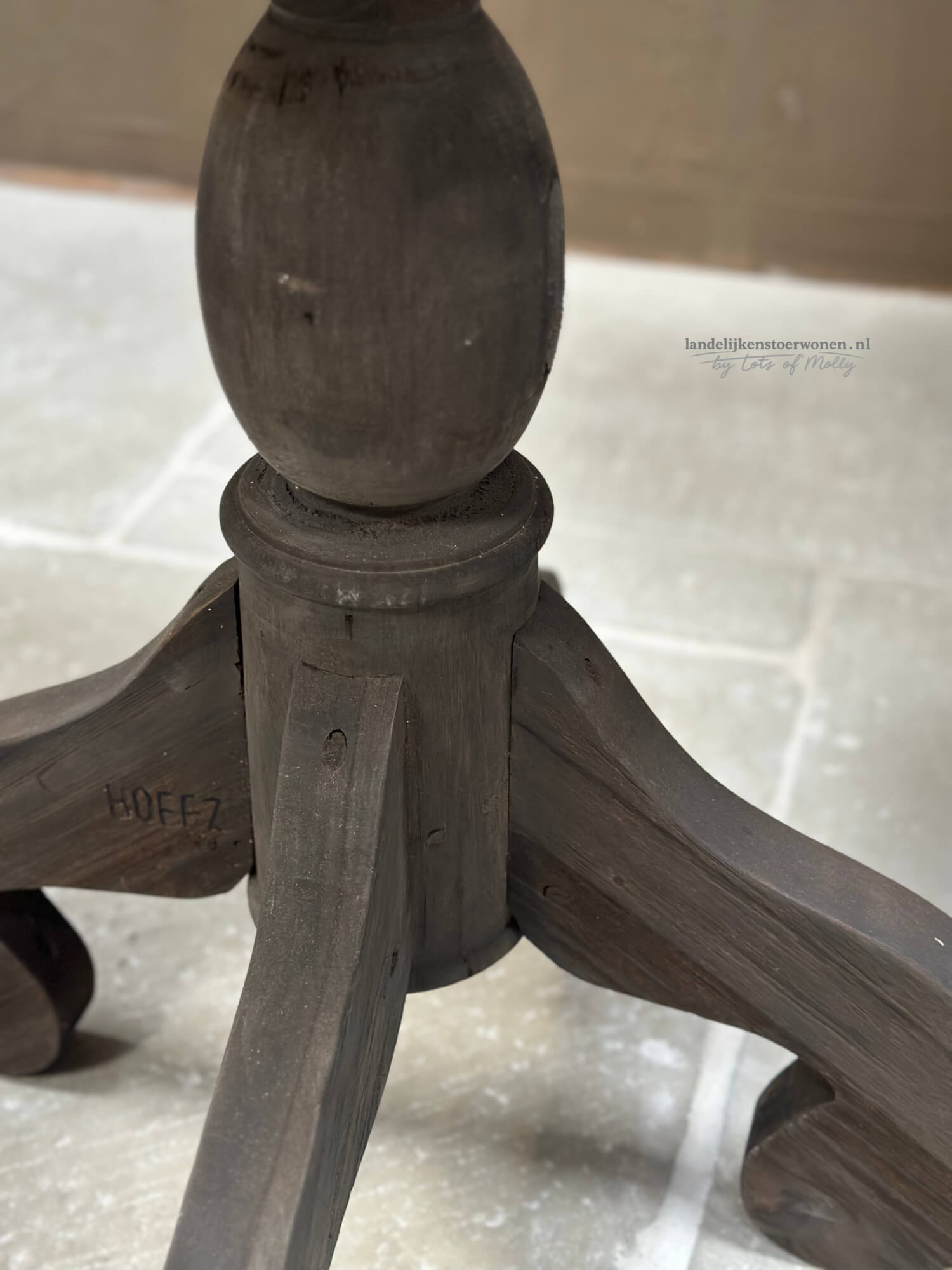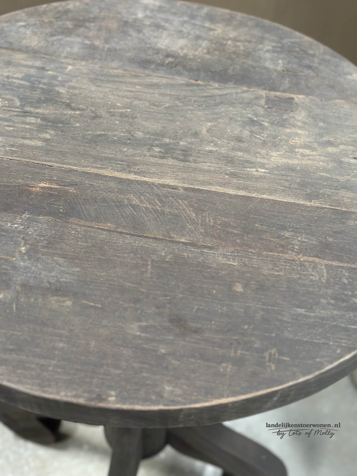 Stoere houten wijntafel van Hoffz met een doorsnede van 60 cm. Het ronde blad en de karaktervolle poot geven deze bijzettafel een warme, landelijke look