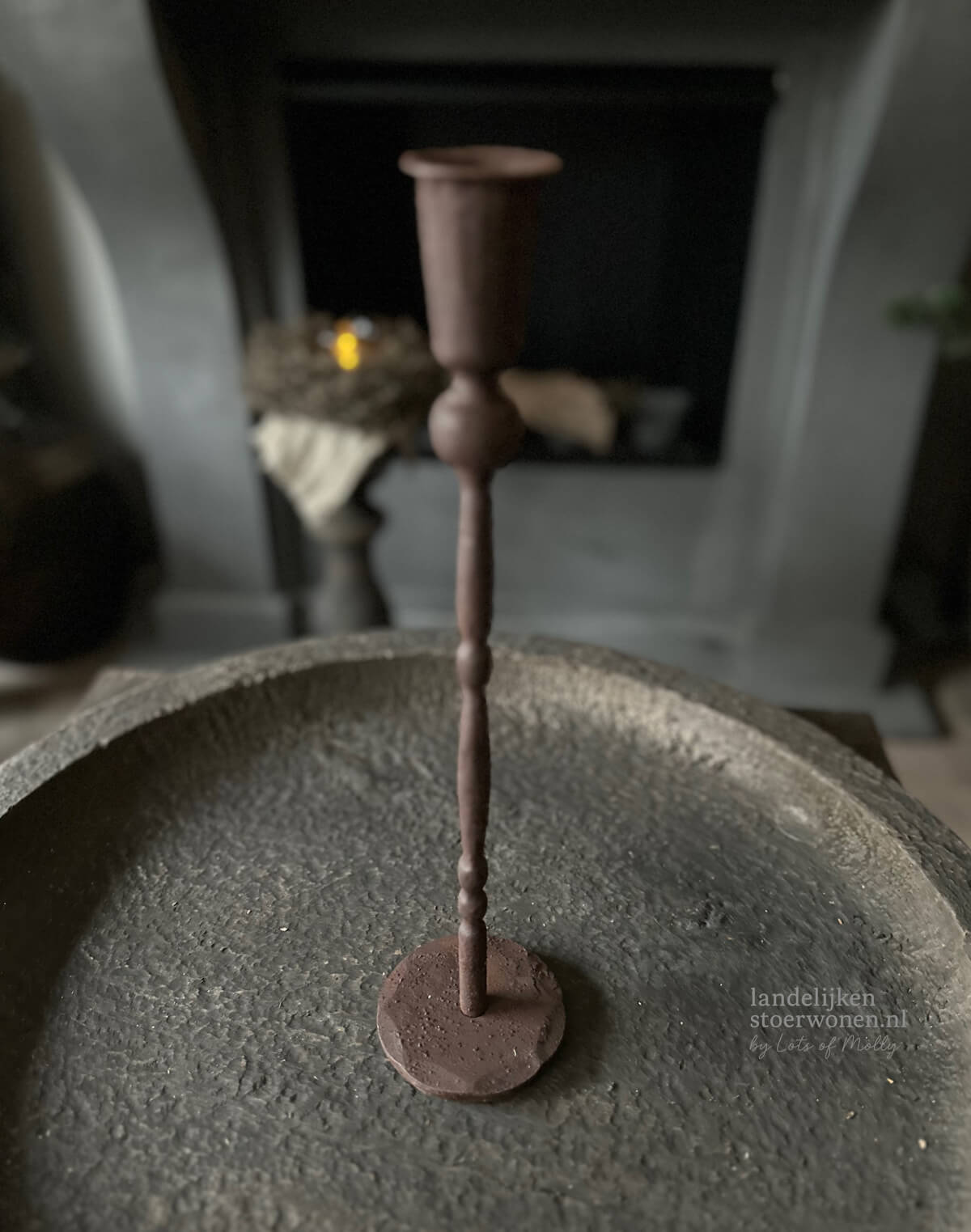 Handgemaakte metalen kandelaar van Hoffz in bruin-roestkleur.