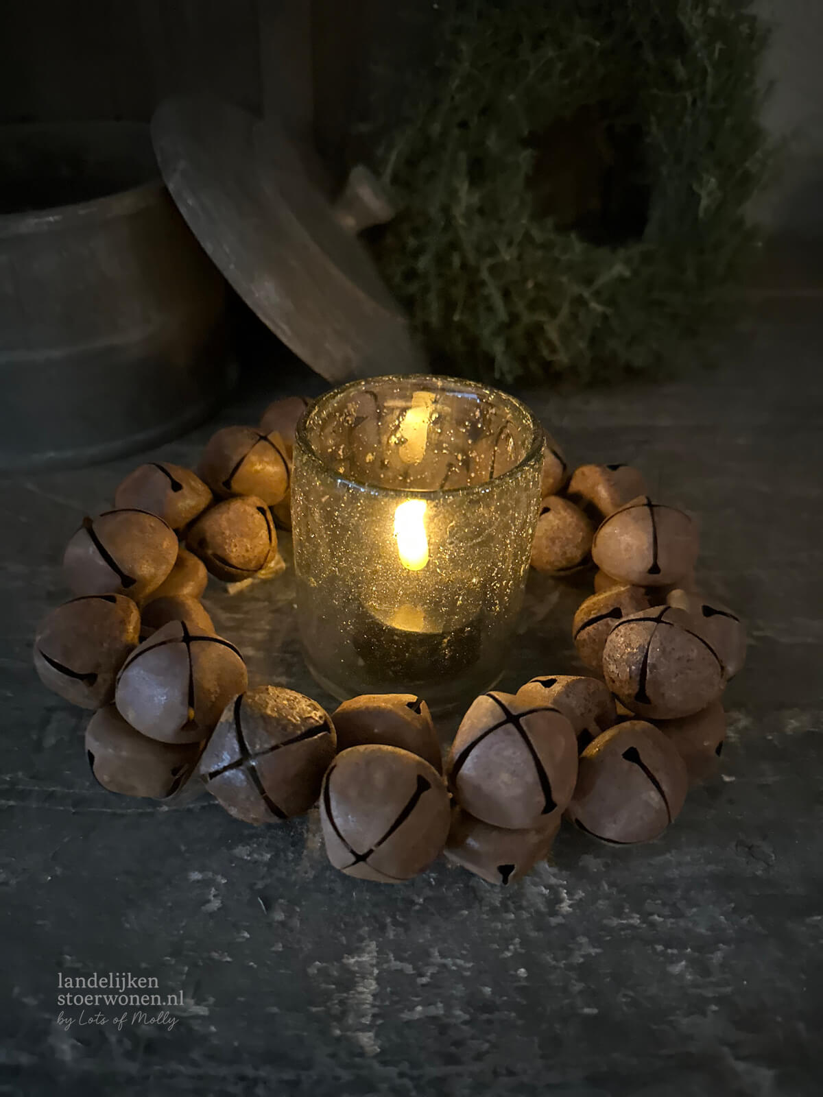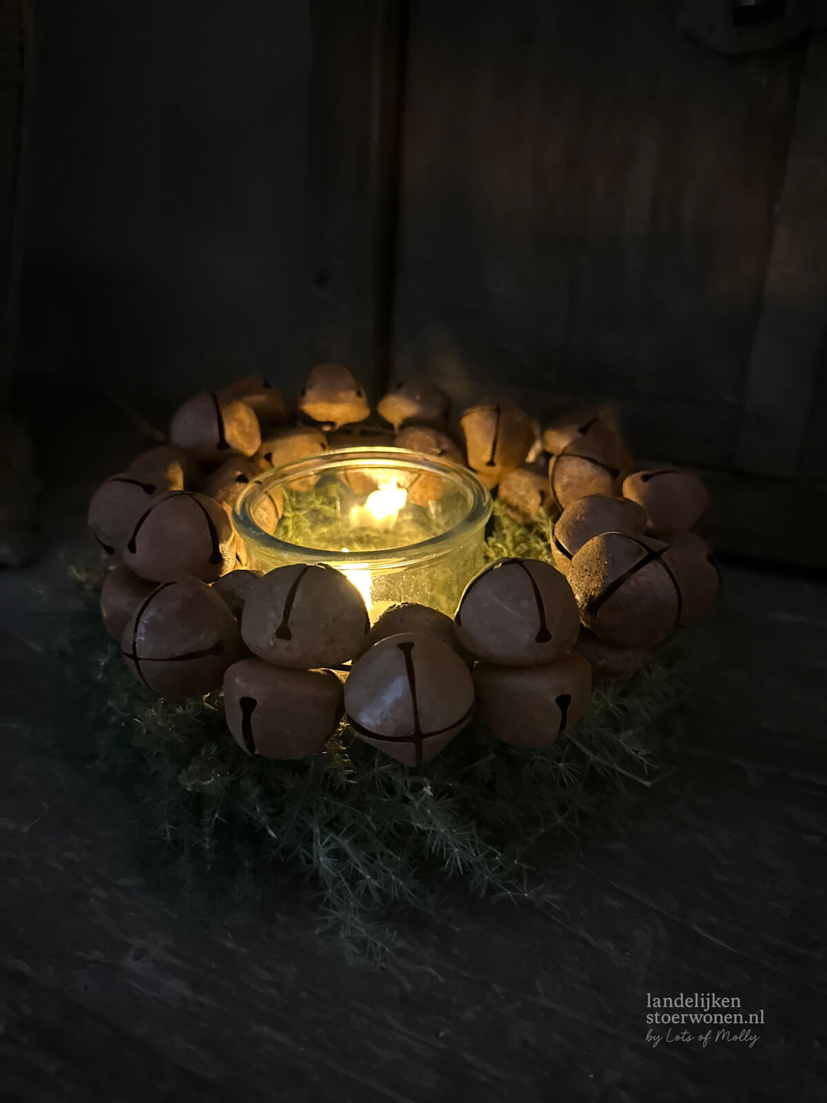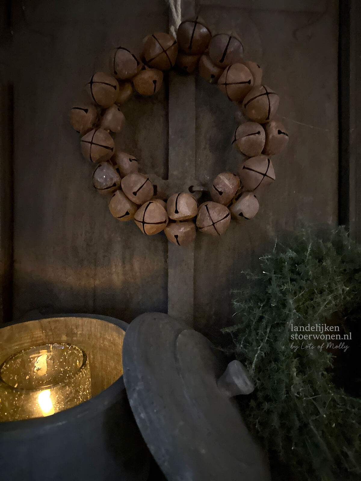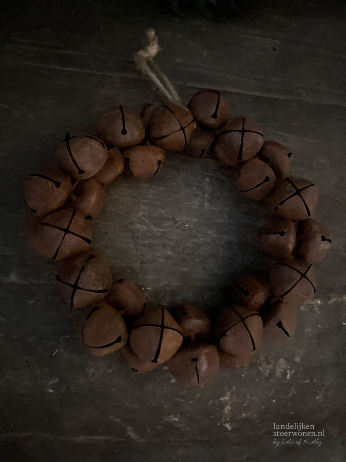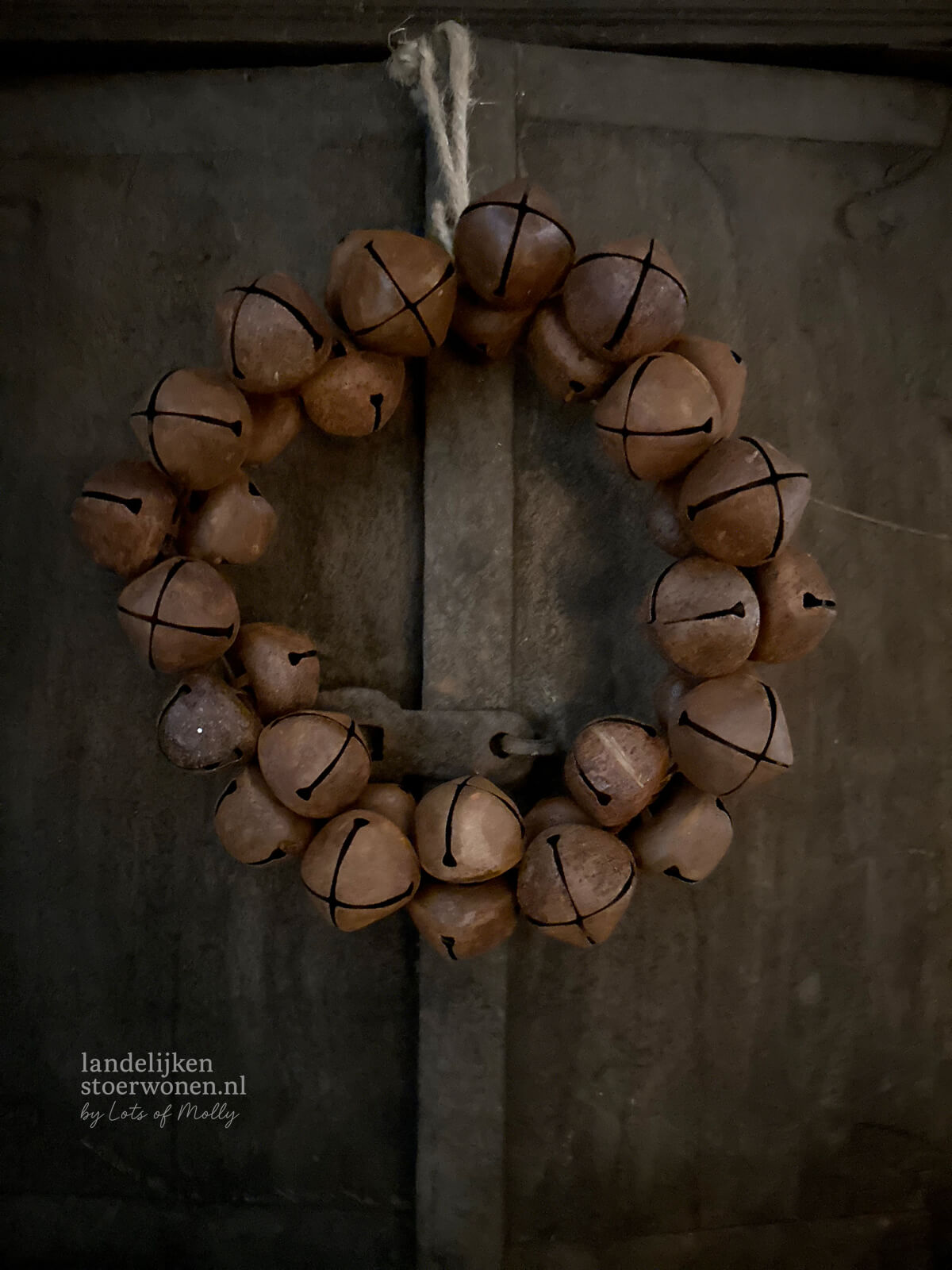 Krans van roestkleurige belletjes. Perfect om aan een kastdeur, haak of wand te hangen.