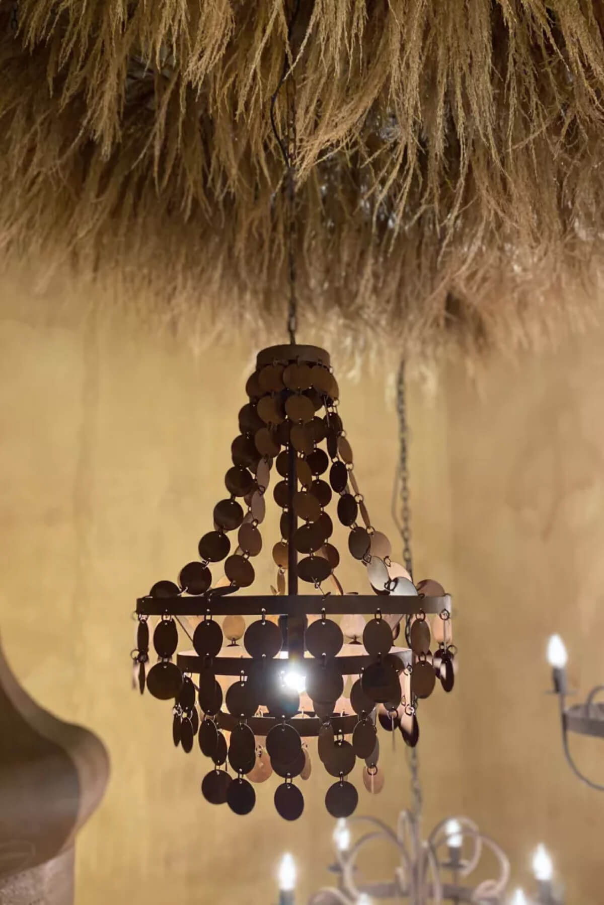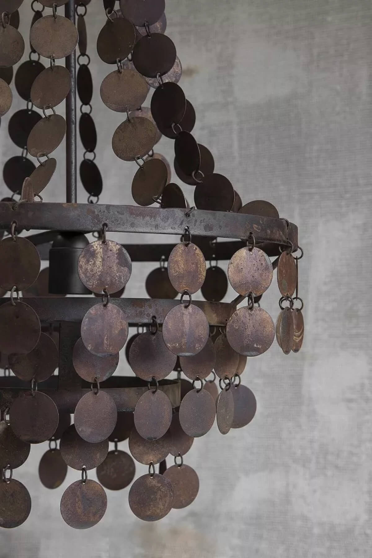 De lamp is opgebouwd uit een prachtig spel van schijven en ringetjes die samen zorgen voor een verfijnde, karaktervolle uitstraling. Dankzij de roestachtige kleur en de met de hand verweerde finish is elk exemplaar uniek.