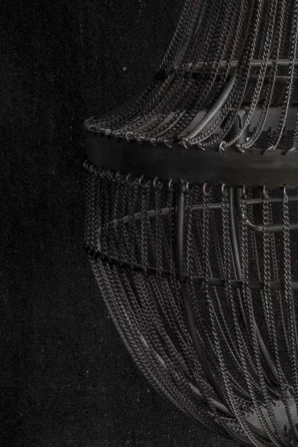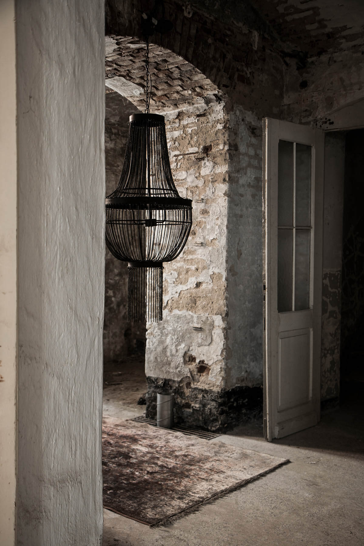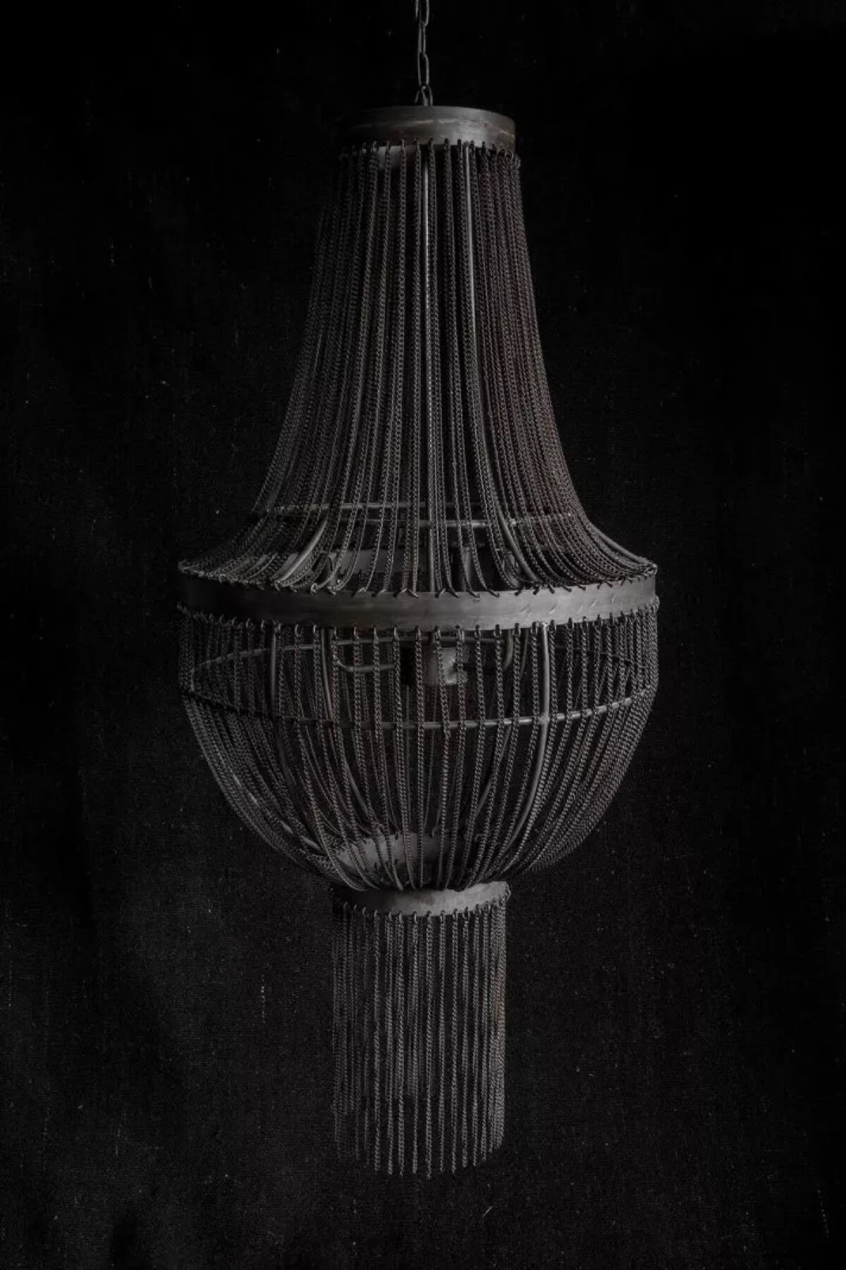 Kroonluchter Pistache van Hoffz. Door de natuurlijke verwering krijgt elke lamp een unieke, doorleefde uitstraling. De kettinkjes aan de onderzijde kunnen naar wens losjes hangen of stijlvol gebundeld worden.