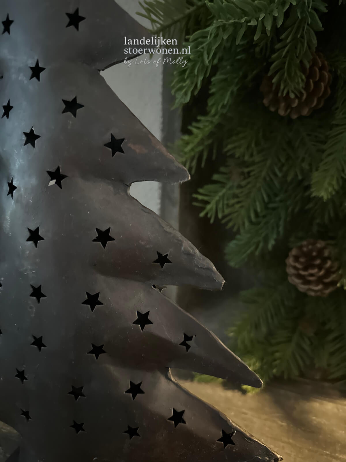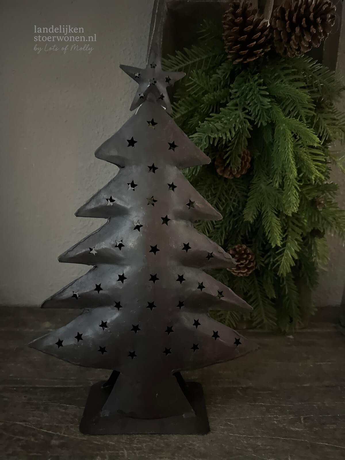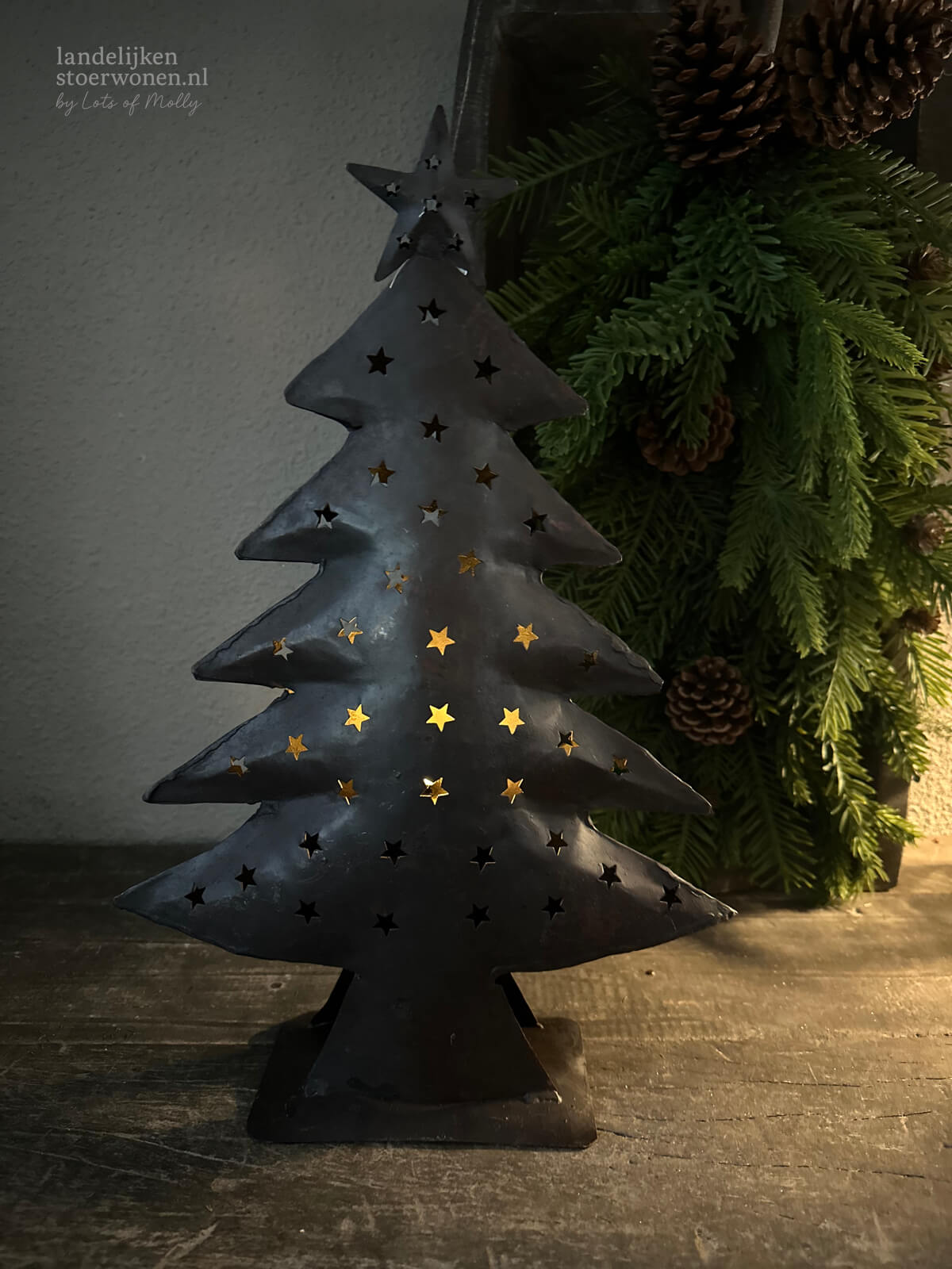 Sfeervolle metalen kerstboom met sterretjespatroon. Aan de achterzijde bevindt zich een deurtje waarin u een waxinelichtje kunt plaatsen.