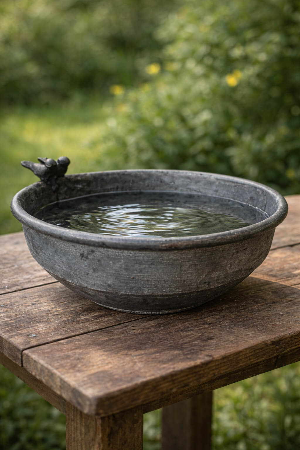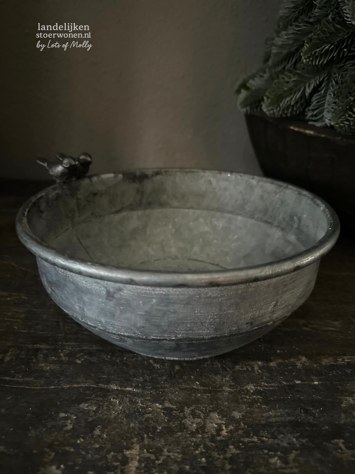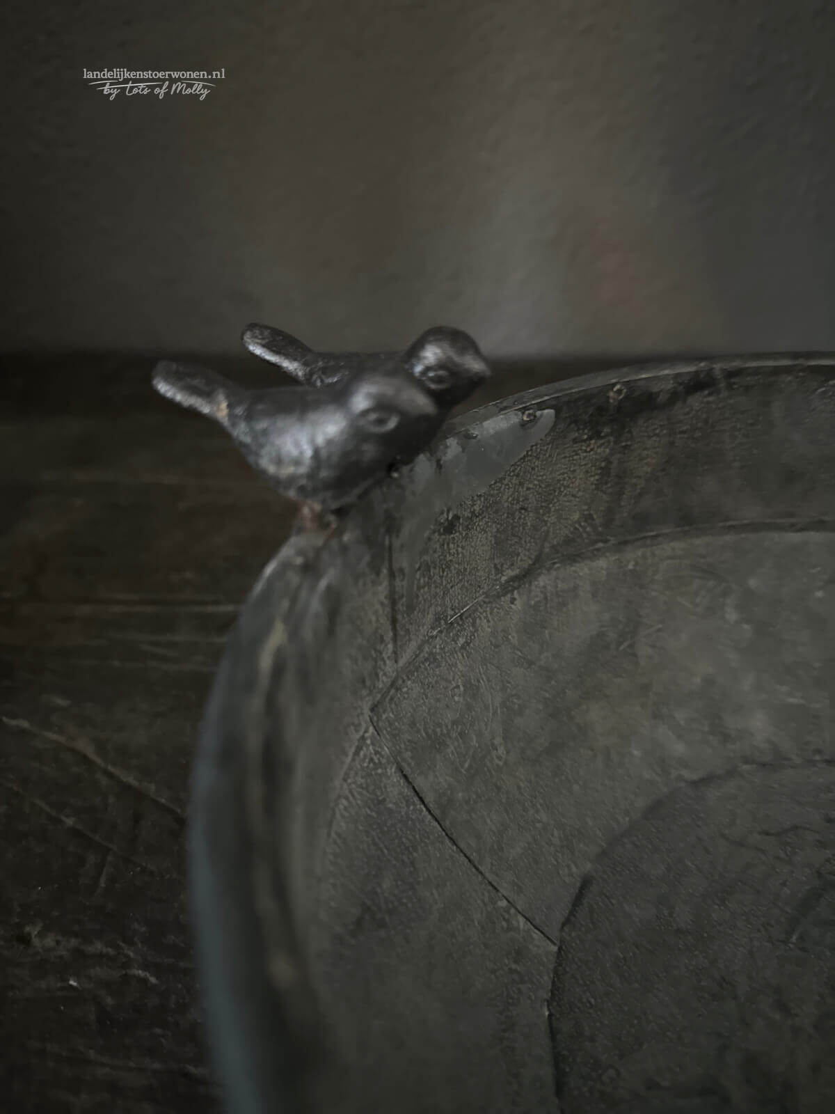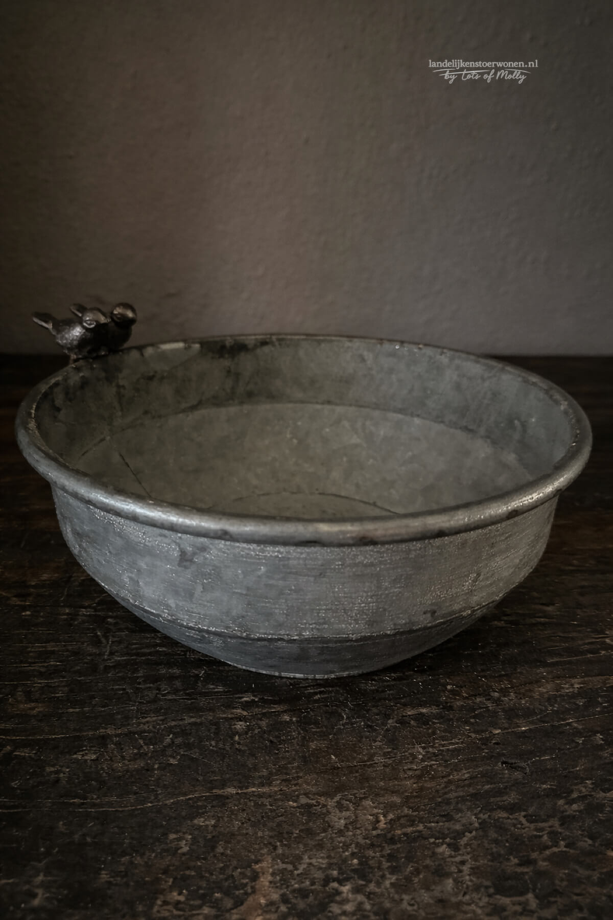 Metalen vogeldrinkbak met twee vogeltjes op de rand.