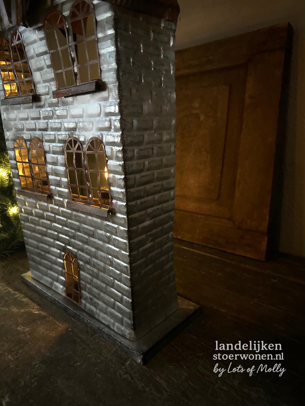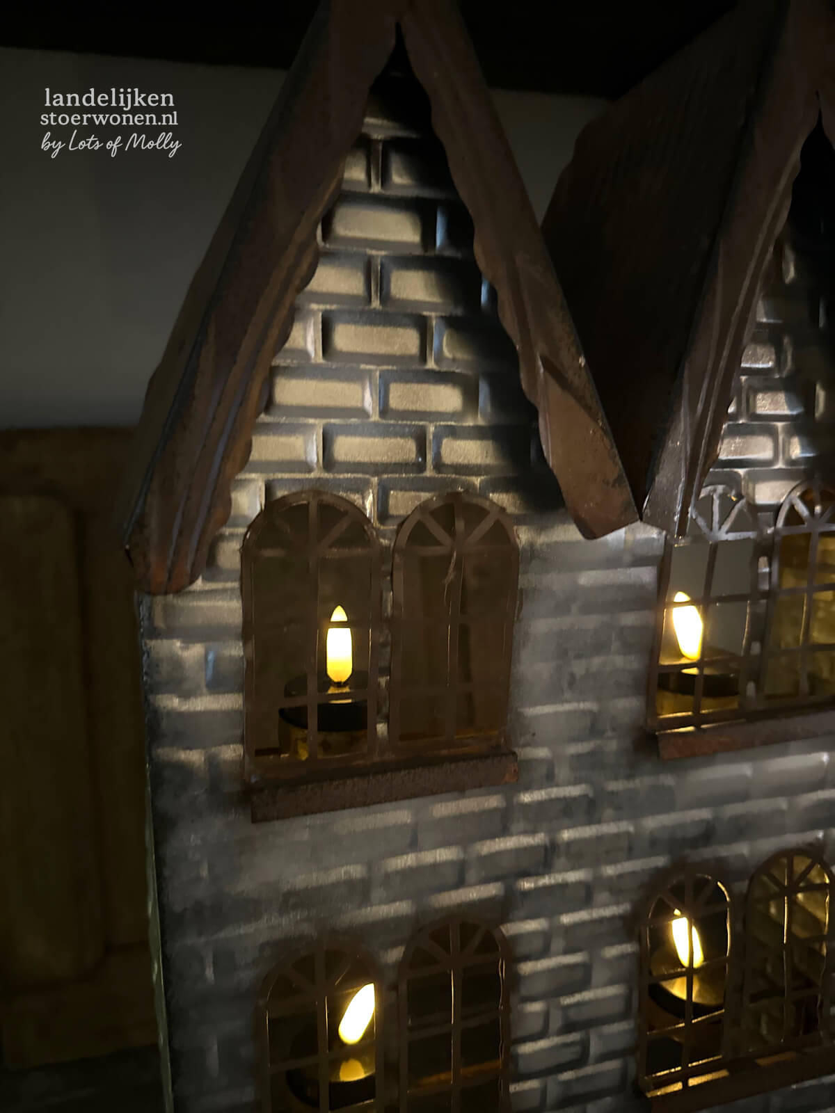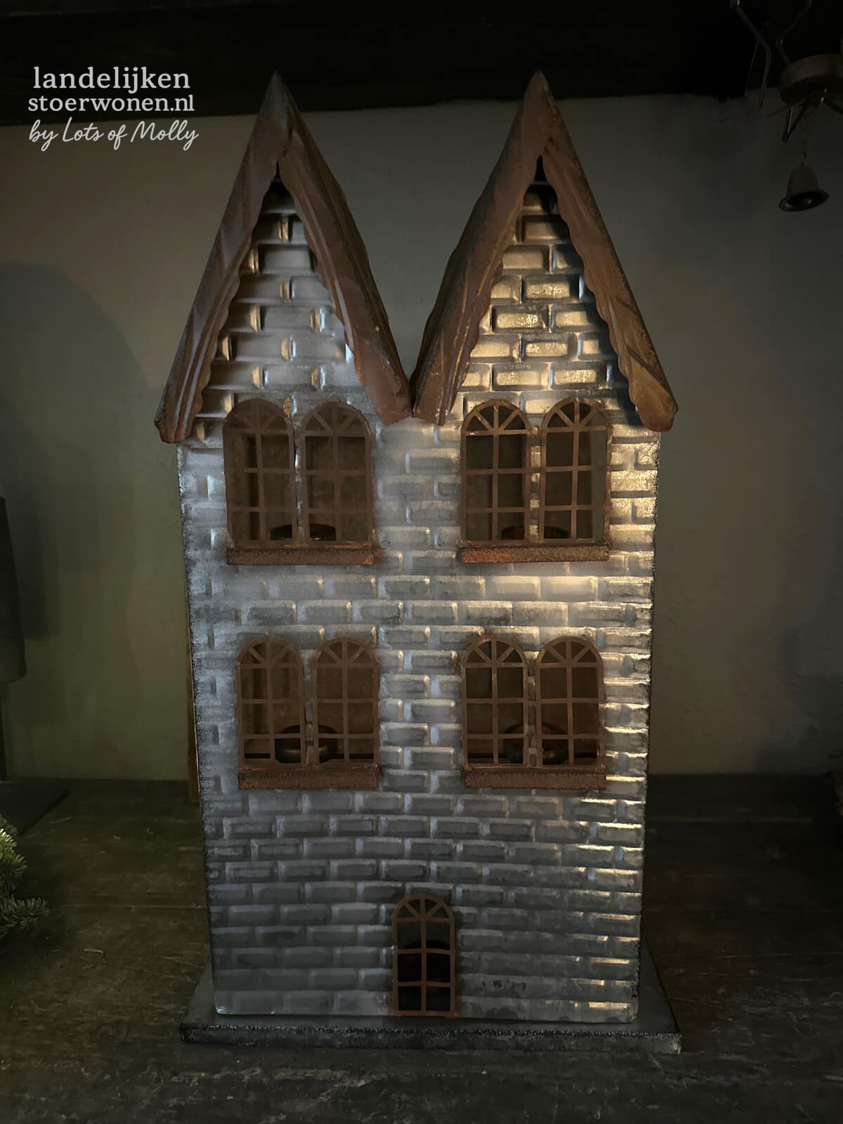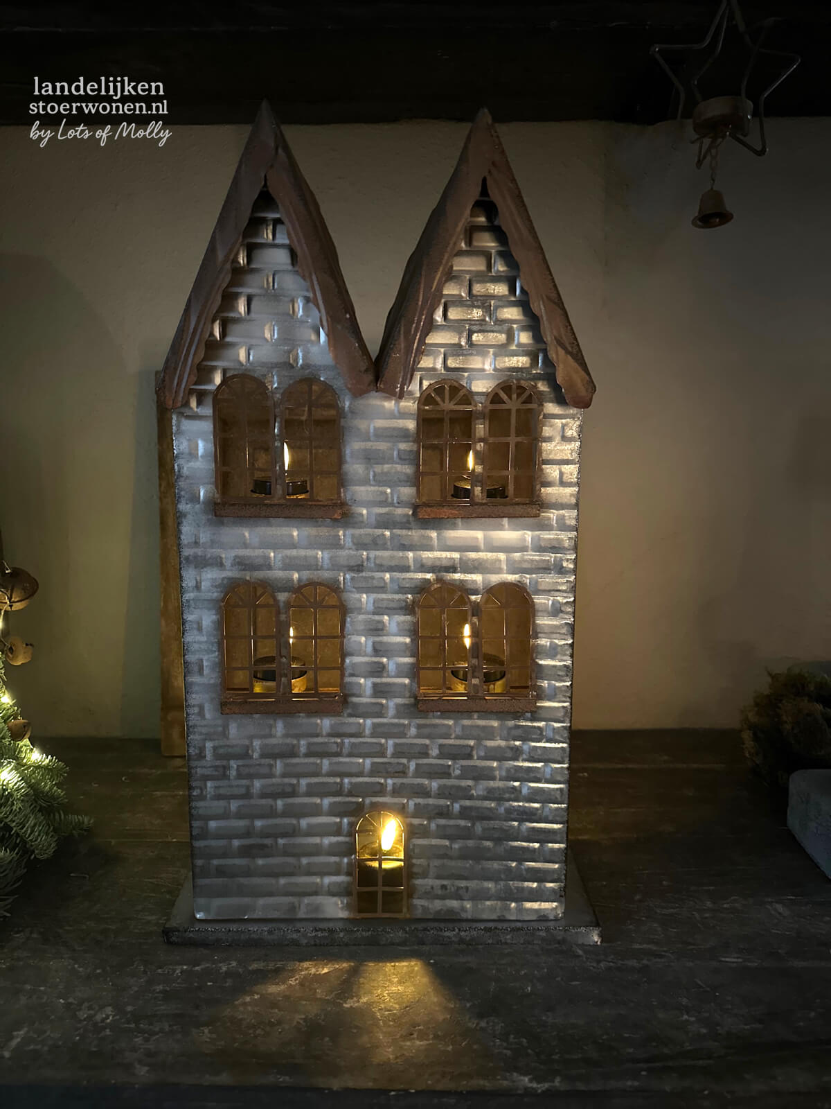 Sfeervolle metalen waxinelichthouder in de vorm van een huis, geschikt voor vijf waxinelichtjes. De ramen zorgen voor een warm en gezellig lichtspel.