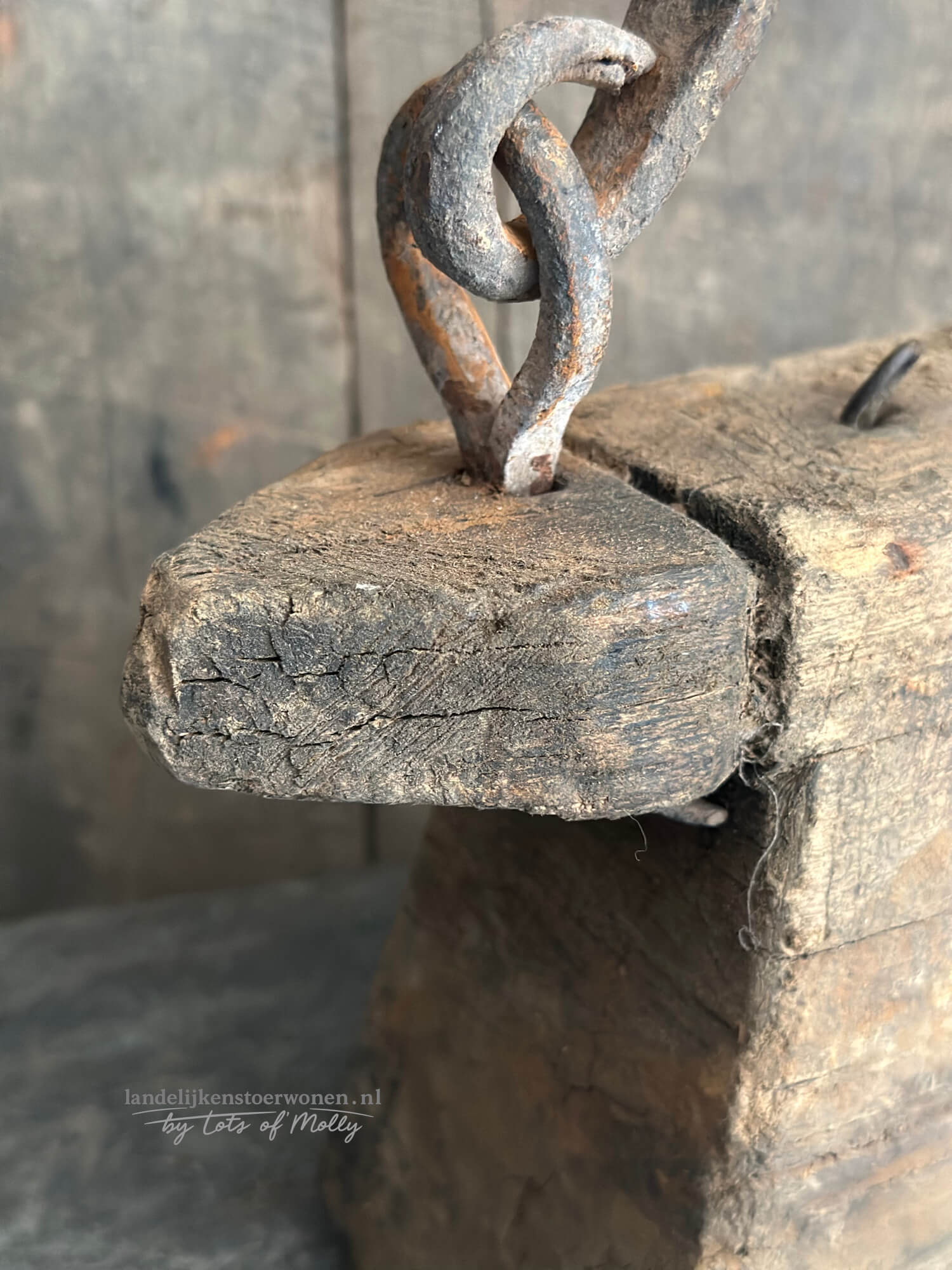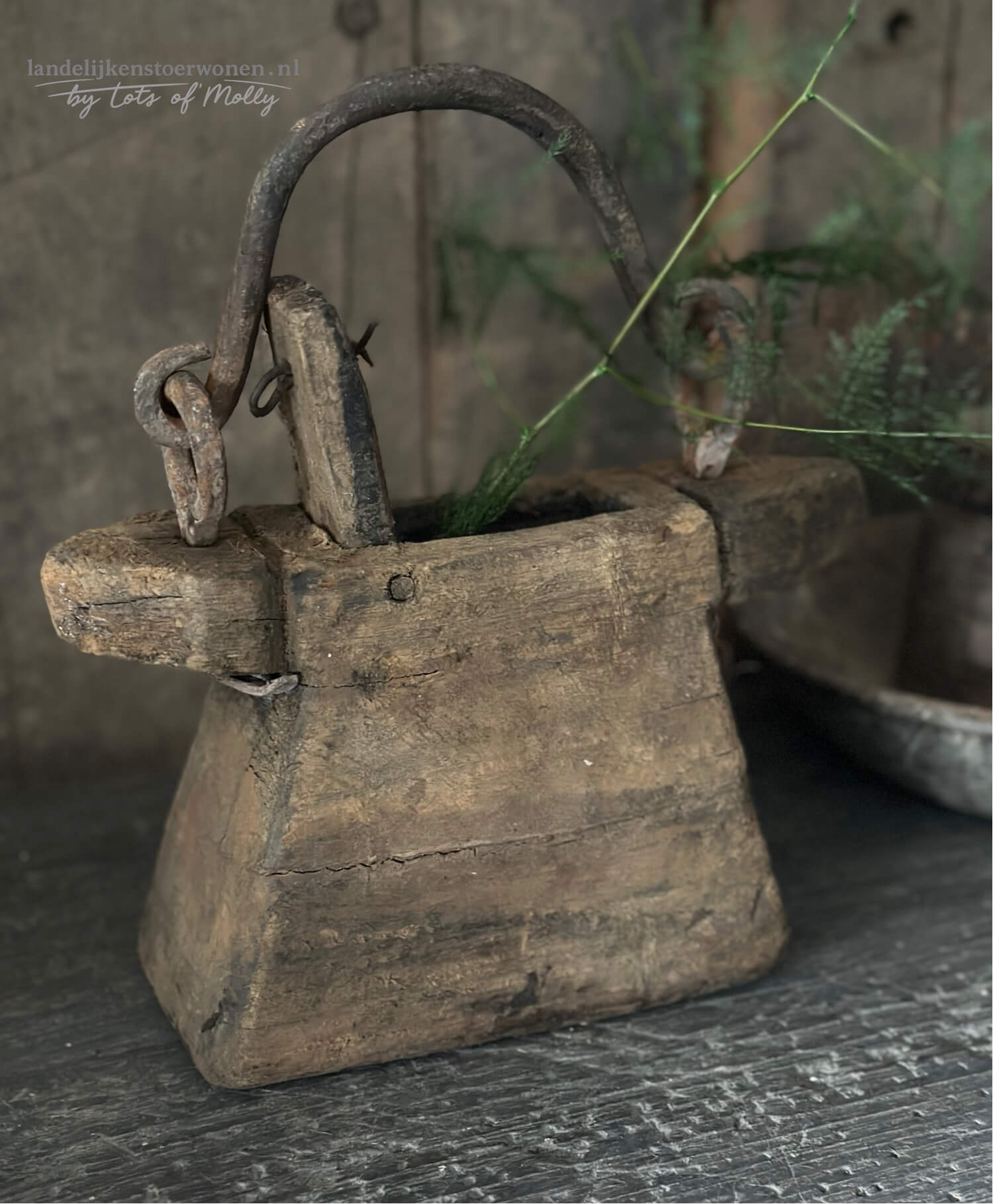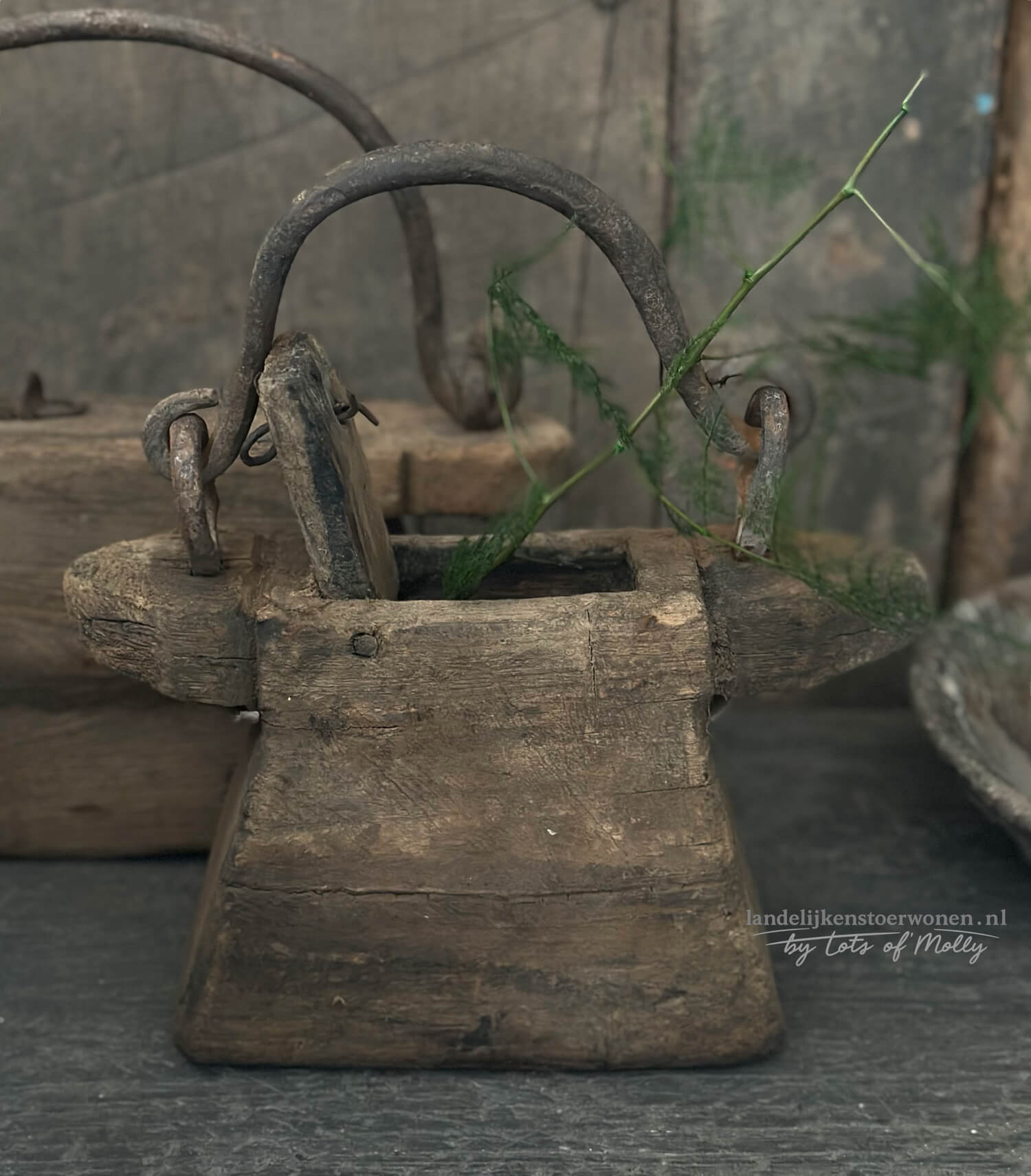 Deze houten oliepot heeft een stoere vorm, met oud verweerd hout en een ijzeren hengsel met wat roest.