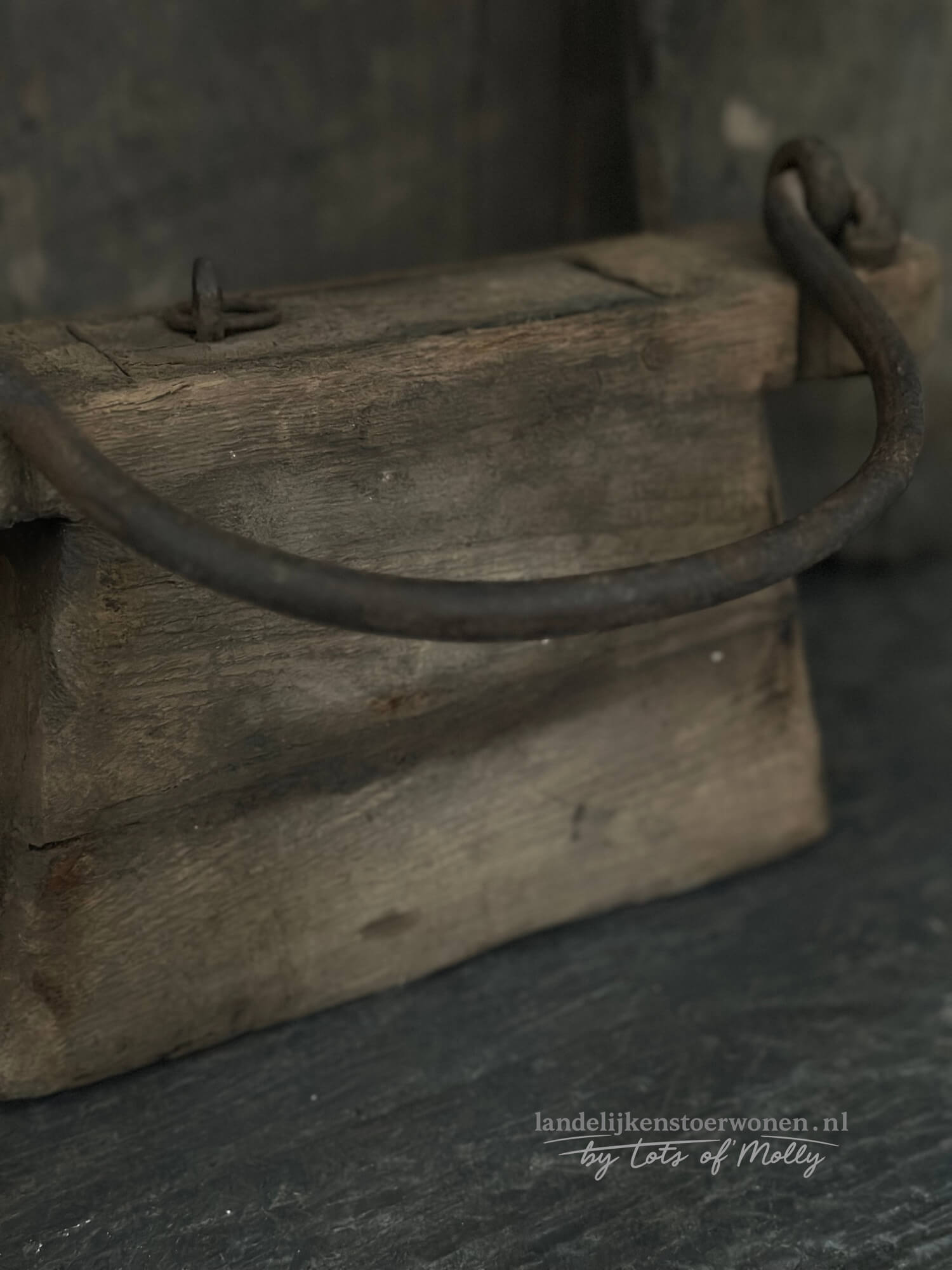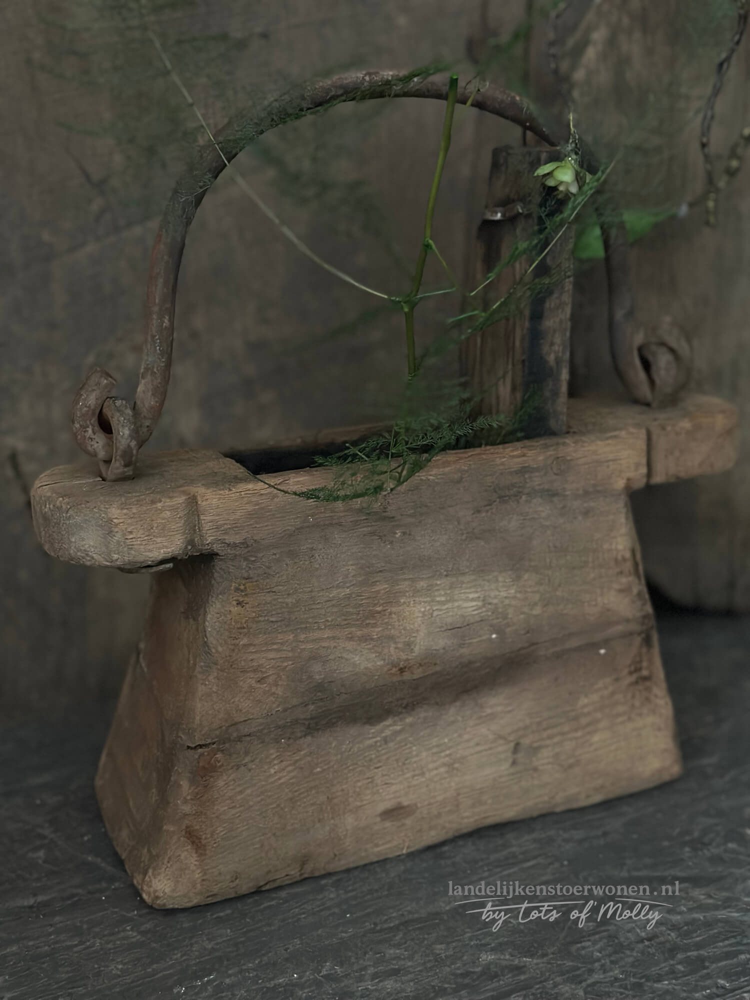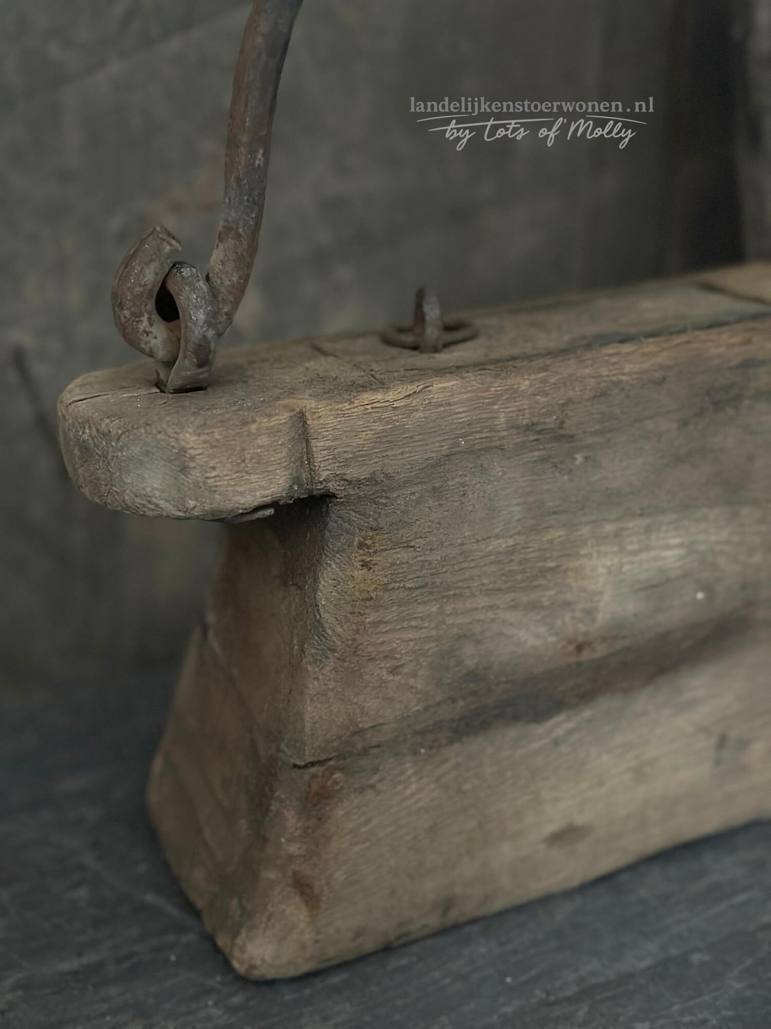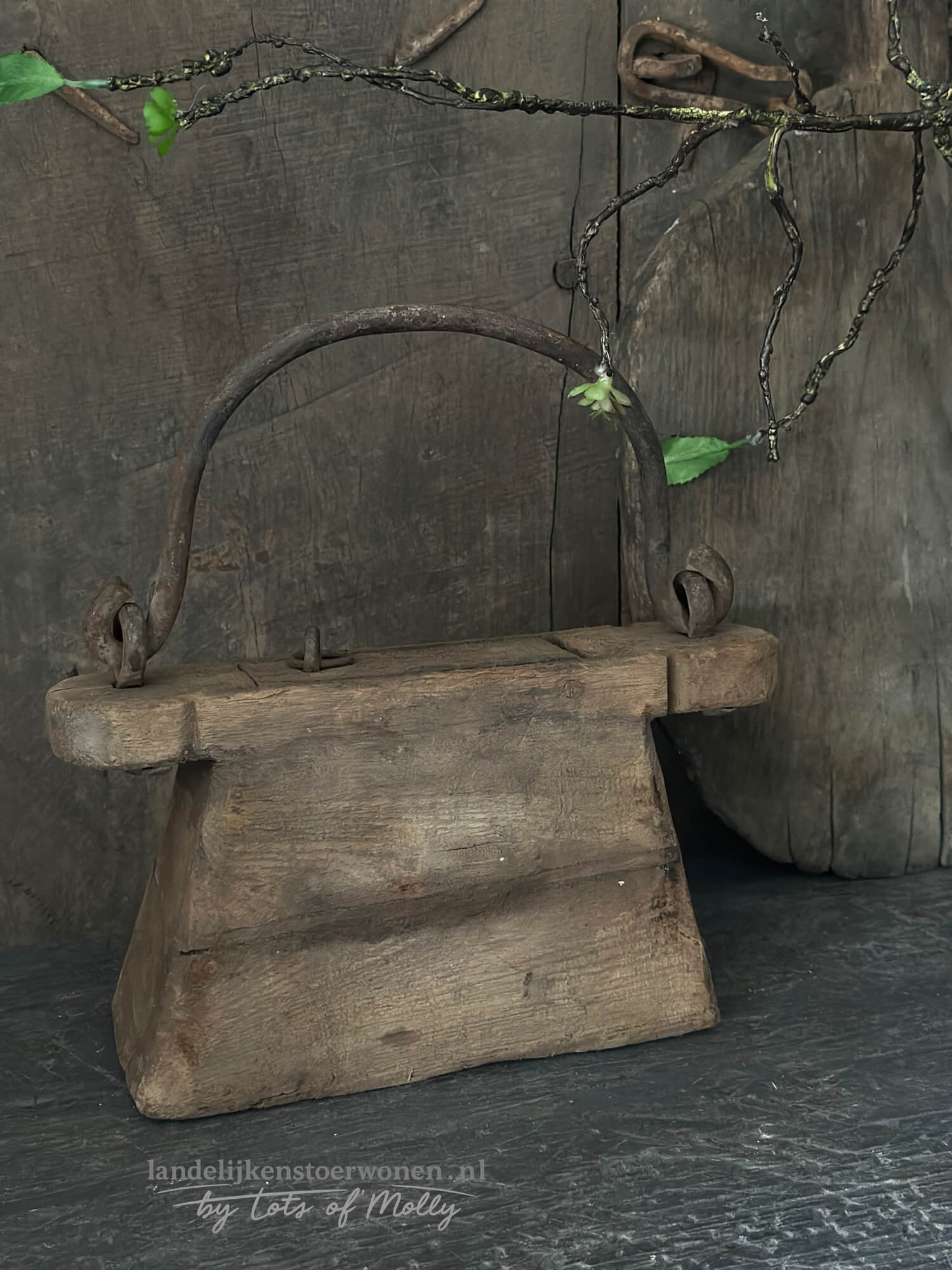 Deze houten oliepot heeft een stoere vorm, met oud verweerd hout en een ijzeren hengsel met wat roest.